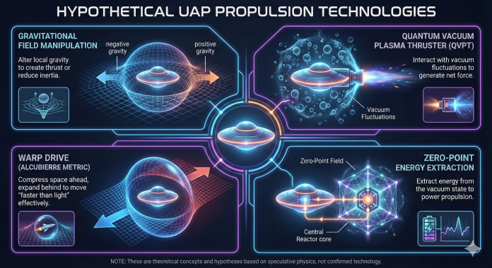 Ultimately, the study of these propulsion technologies provides a structured lens through which to analyze UAP data. While these concepts remain speculative and push the boundaries of current human capability, they offer a coherent explanation for the anomalous flight patterns documented by military and civilian observers. The convergence of gravitational manipulation, warp metrics, and quantum vacuum interaction suggests a future where aerospace travel is defined not by the combustion of fuel, but by the mastery of the environment in which the vehicle operates. Achieving this reality will require unprecedented breakthroughs in high-energy physics and the ability to engineer matter at the quantum scale.